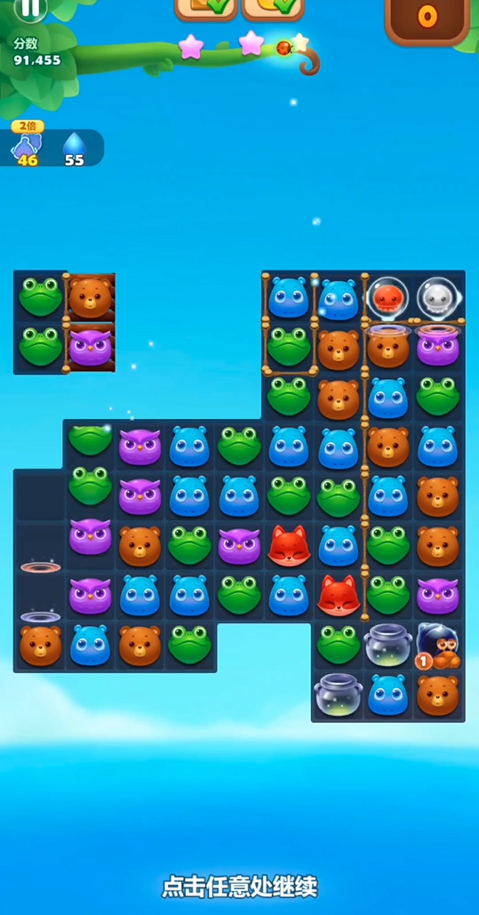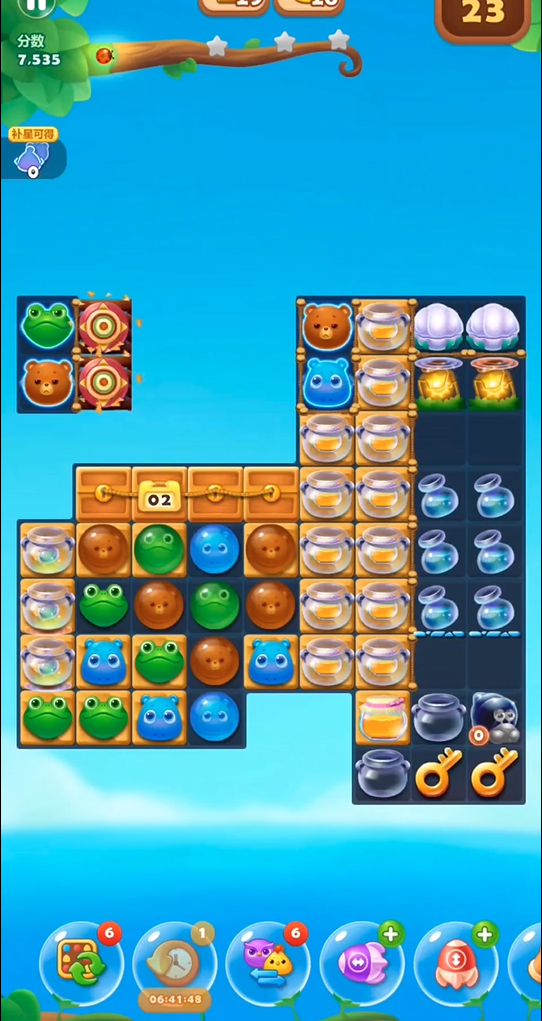 在消除几轮后关卡下方会出现染色宝宝和星星瓶道具,当它们集满能量时建议互相交换以产生大范围消除效果。大眼仔提供的特效通常局限于小范围,而染色宝宝与星星瓶的组合能覆盖更广区域,显著提升清除效率。玩家需要观察道具充能状态并及时进行交换,这有助于快速处理密集的冰块和雪块障碍。中期阶段地图中央区域成为消除重点,因为其他位置大多被障碍物阻挡,只有通过连续消除才能引入新动物并扩大可操作空间。